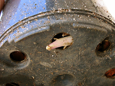 Senecio stapeliformis pertence à família Asteraceae e é uma planta realmente interessante. A minha já tem alguns anos e seu crescimento é muito lento. Ela nunca deu flores. Apesar disso, de vez em quando tenho que replantá-la, pois ela acaba derrubando o vaso! Simplesmente solta brotos por baixo que saem pelos furos do vaso e acabam por deixá-lo bambo. Veja a foto: